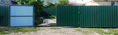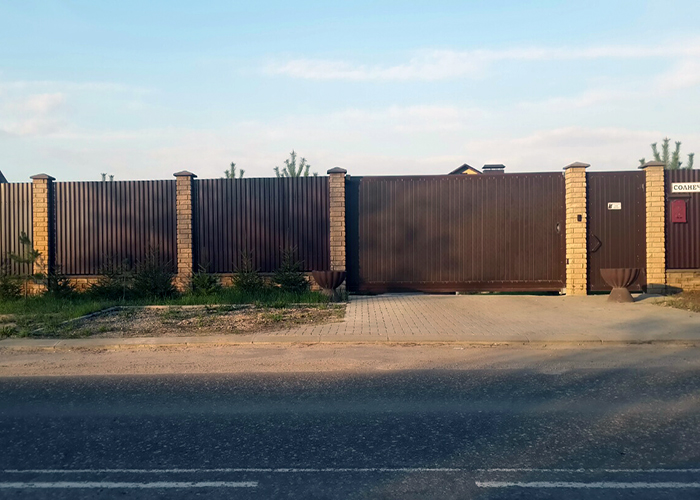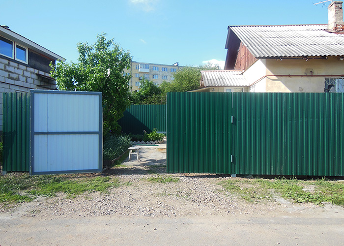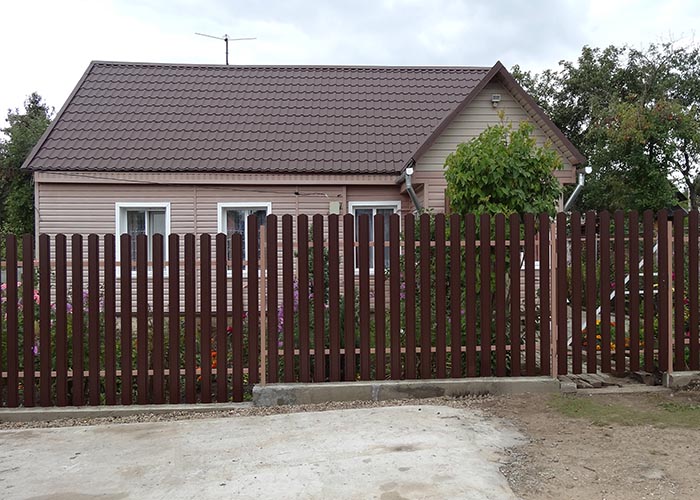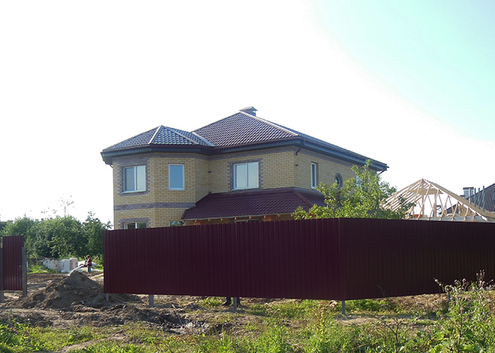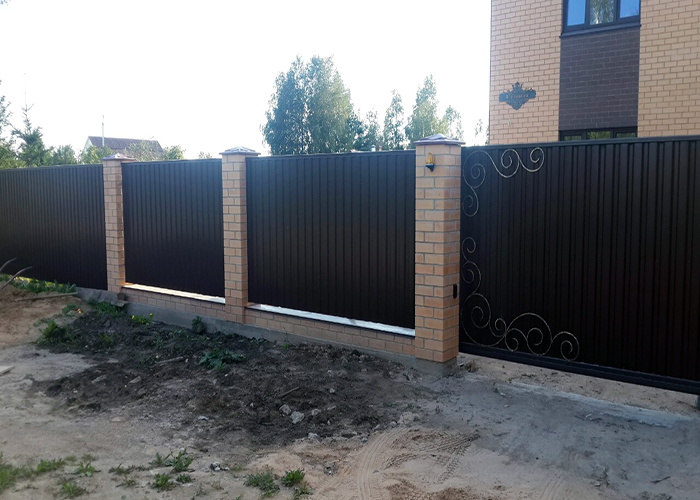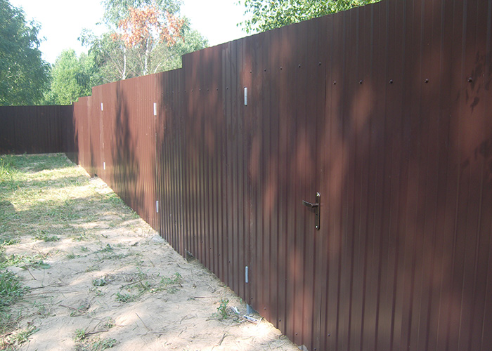 Одним из самых распространенных заборов является забор из профлиста. Для его создания используется профилированные столбы и напрявляющие.
