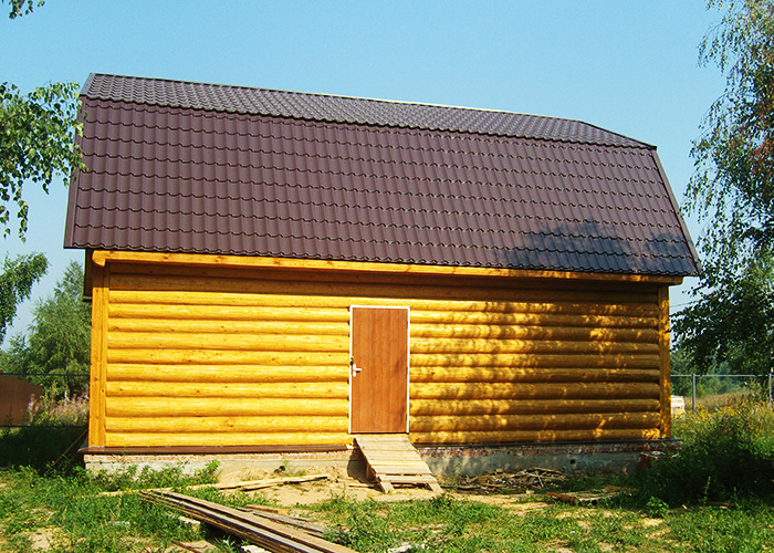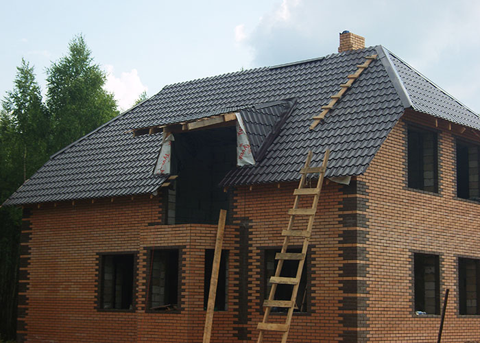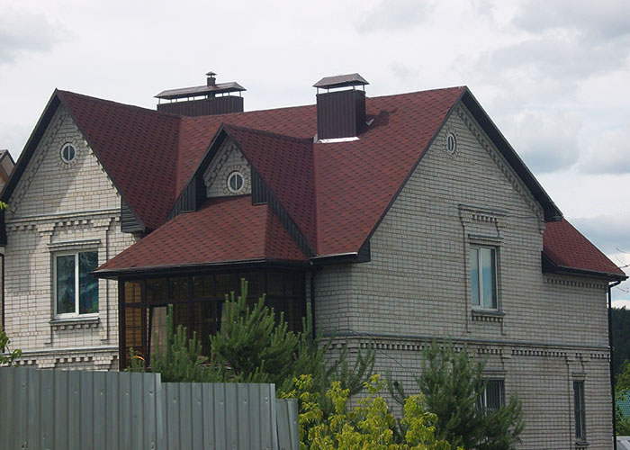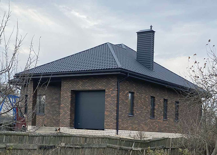 Классическая двускатная крыша с использованием металочерепицы. Возможно монтирование манцардных окон, для придания освещенности помещению.